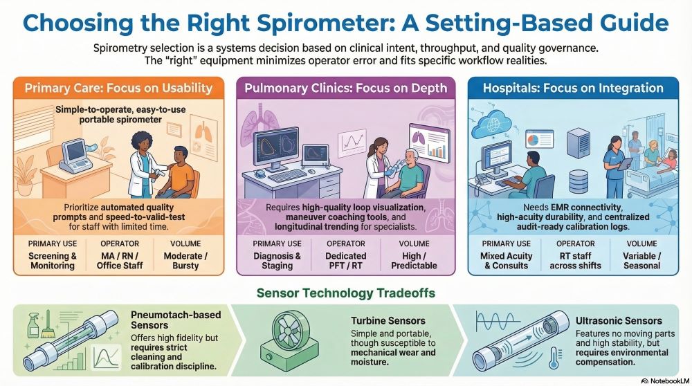 A primary care office generally needs speed, simplicity, and robust quality prompts. A pulmonary clinic needs tighter technical control, interpretive depth, and advanced maneuver support. A hospital needs multi-user durability, integration, and strict infection prevention in higher-acuity populations.