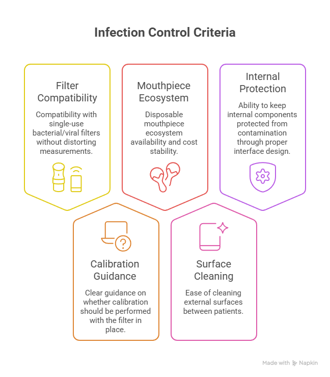 Spirometry involves forced exhalation and close contact with patient interfaces, which raises the stakes for infection prevention. Device designs differ in how easily they support safe workflows with minimal shortcuts.
