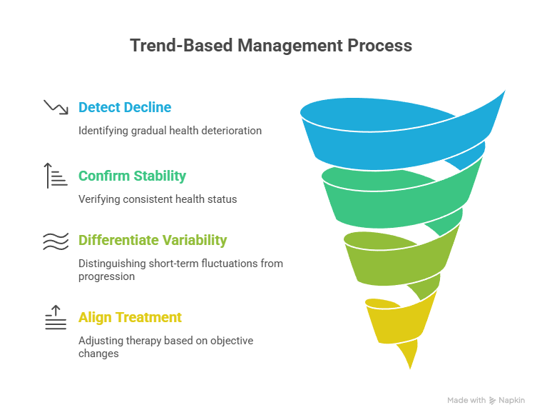 Modern systems separate natural variability from meaningful decline using consistent reference comparisons. This distinction prevents unnecessary escalation during transient fluctuations. Stable trends support treatment de-escalation when appropriate.