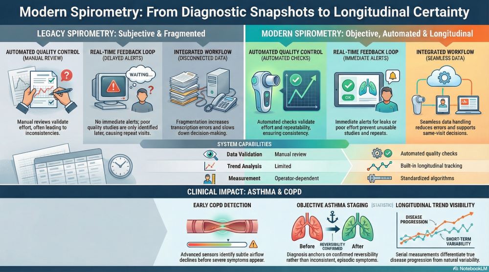 Longitudinal trending transforms spirometry from a diagnostic snapshot into a disease-management tool. Serial measurements reveal progression patterns that symptoms alone cannot capture. Trend visibility supports earlier therapeutic adjustments and validates treatment effectiveness. Continuous data strengthens shared decision-making between clinicians and patients.
